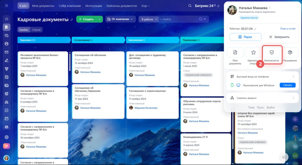 Один из самых надёжных и при этом простых инструментов — двухфакторная аутентификация в Битрикс24. Она добавляет дополнительный уровень проверки при входе: кроме логина и пароля требуется подтвердить действие вторым способом. Даже если пароль станет известен третьим лицам, войти в систему без подтверждения не получится.