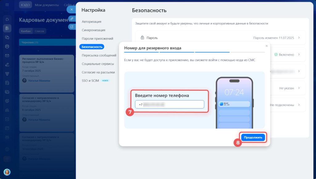 Укажите номер телефона для резервного входа.
