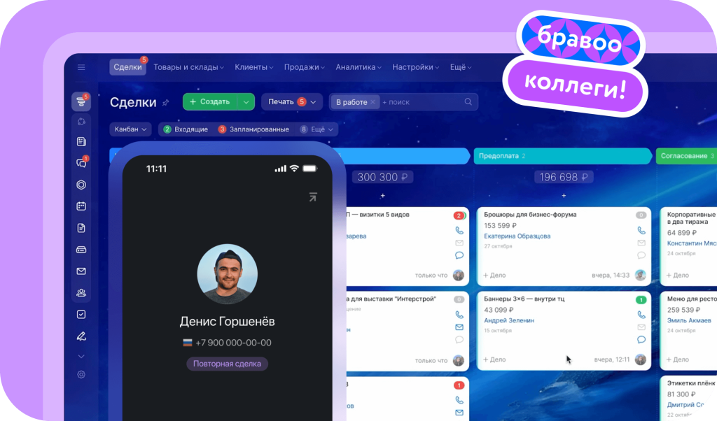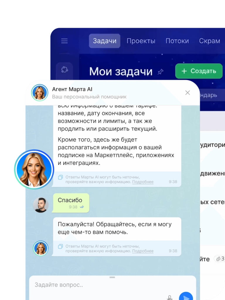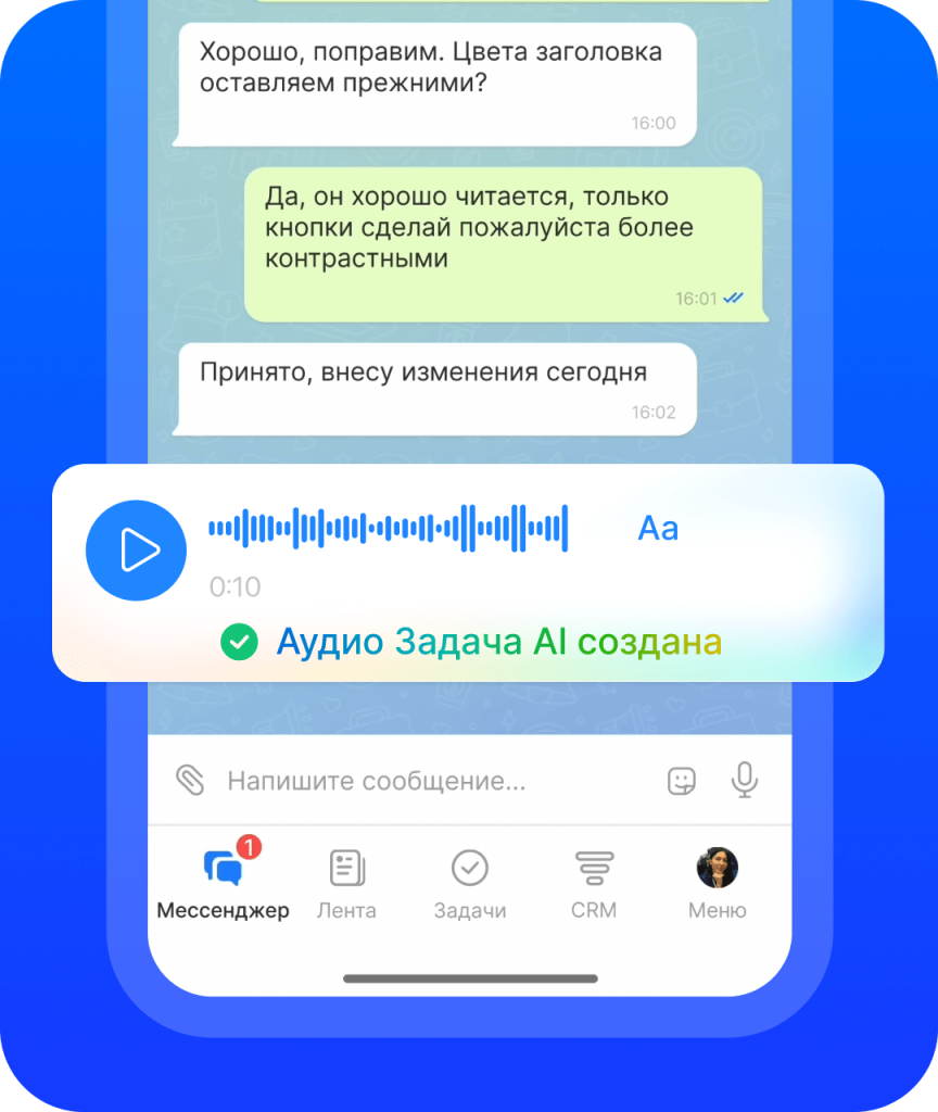 AI-агенты выполняют поручения: создают задачи, обновляют данные, планируют встречи. Всё — в одном окне.
