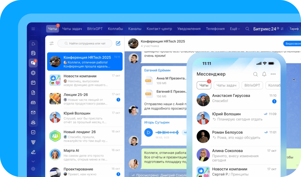 Битрикс24 перестроил интерфейс вокруг чата. Теперь это не просто мессенджер, а центральная точка взаимодействия команды. Задачи, обсуждения, файлы и результаты — всё доступно в одном окне.