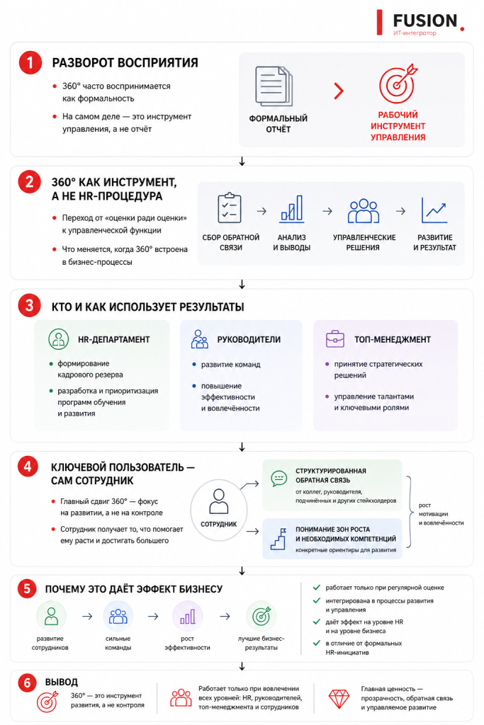 Дополнительно эксперты отмечают, что регулярная обратная связь повышает вовлеченность сотрудников и усиливает их участие в процессах компании. Таким образом, оценка 360 становится не просто HR-инструментом, а частью системы управления эффективностью.