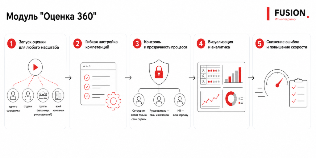 Модуль «Оценка 360» от Фьюжн позволяет выстроить процесс оценки как управляемую систему — от запуска до аналитики. Оценку можно проводить как точечно, для конкретного сотрудника, так и масштабно — на уровне отделов, групп или всей компании. При этом система автоматически формирует круг участников и позволяет подключать внешних респондентов (например, клиентов), не раскрывая внутренние данные компании.
